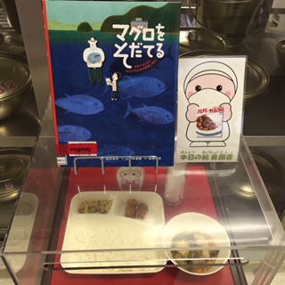 写真中央は本日の給食図書と献立サンプルです。本日の給食図書は「マグロをそだてる」でした。世界で初めて、クロマグロの完全養殖に成功するまでの道のりが書かれた図書でした。