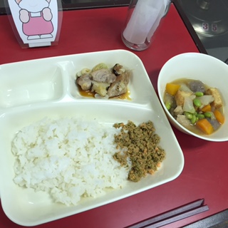 本日の献立は「焼きとり・豚肉とあつあげの煮もの・紅ざけそぼろ・ごはん・牛乳」でした。