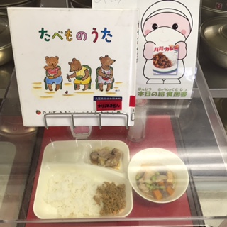 写真中央は本日の給食図書と献立サンプルです。本日の給食図書は「たべものうた」でした。焼きとりの歌や、おにぎりの歌など、たくさんの歌が載っていました。