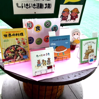 写真右は玄関に設置している今週の給食図書コーナーです。今週は「たべものうた」の他に、「世界の料理・ハンバーグーチョキパー・こぶたのピクルス」を紹介しています。