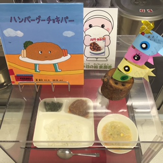 写真中央は、本日の給食図書と献立サンプルです。本日の給食図書は「ハンバーグーチョキパー」でした。2人のハンバーグが、どちらが道を譲るかを、じゃんけんで決める楽しい絵本でした。