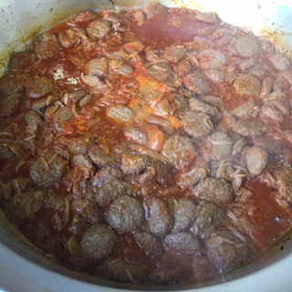 煮こみハンバーグは、炒めたたまねぎ、ハンバーグをケチャップ、ウスターソースで味付けして煮込んだ献立でした。