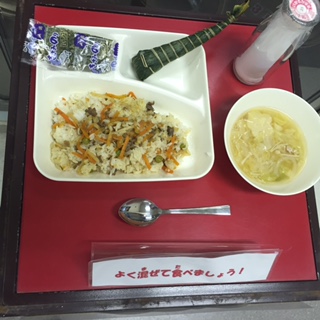 本日の献立は「こどもの日の行事献立」で、「牛肉のちらしずし・すまし汁・ちまき・牛乳」でした。