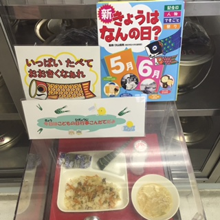 ちまきは、焼き物機で蒸したものが出ました。ちまきは、もちを笹の葉でまいて、蒸して作ります。5月5日のこどもの日に、「子どもが元気で大きくなりますように」という願いをこめて、みんなで食べます。
