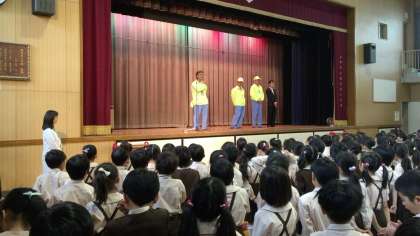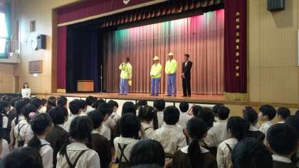 講堂で行われた全校朝会には、鶴見区の安全パトロールの方が来られました。ふだん子どもたちの登下校を見守ったり、青色パトロールカーで地域の安全を呼びかけたりしてくださっている方々です。隊長の方からは「子どもたちの元気なあいさつは、町の大人の人を元気にしてくれます。それが安全な町づくりにつながります。」と「自転車に乗る時は二人乗りをしないなど交通ルールを守りましょう。」というお話がありました。