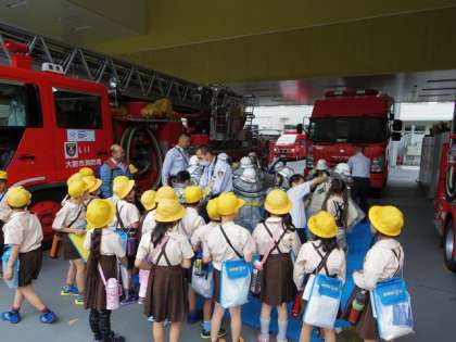 消防署では訓練の様子を見たり、防護服を着て消防士さんと敬礼をしたりしました。