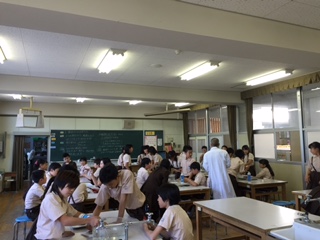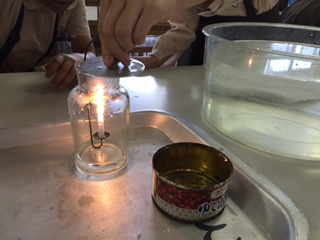 6年生は理科の「酸素のはたらきを調べよう」で「ものが燃えるとき、酸素はどんなはたらきをしているのだろうか」という課題について実験を通して調べています。初めにグループで予想を立ててから、理科室のいろいろな実験器具を正しく使って実験を進めていきます。びんの中のろうそくの火を見つめる目は真剣そのものです。各グループの結果をもとに結論を出していく中で、子どもたちの科学的思考力が養われます。これからも楽しく、真剣に実験に取り組んでほしいですね。