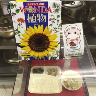 写真中央は、本日の給食図書と献立サンプルです。本日の給食図書は「ポプラディア大図鑑 ワンダ 植物」でした。たくさんの木や草の中に海藻も載っていて、本日使われたひじきも載っていました。