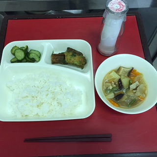 本日の献立は、「ちくわのいそべあげ・鶏肉とじゃがいも煮もの・あっさりきゅうり・ごはん・牛乳」でした。