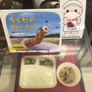 写真中央は、本日の給食図書と献立サンプルです。本日の給食図書は、「ちくわのわーさん」でした。ちくわのわーさんが、道中でたくさんのものと出会う絵本でした。