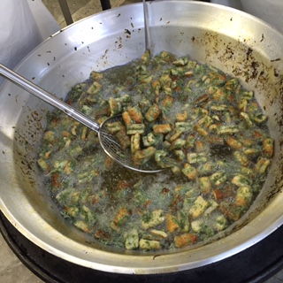 写真右は、ちくわのいそべあげを揚げている様子です。