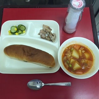 ケチャップ煮は、豚肉、にんじん、たまねぎ、じゃがいも等が入った煮もの献立でした。