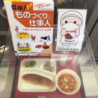 写真中央は、本日の給食図書と献立サンプルです。本日の給食図書は、「探検!ものづくりと仕事人」でした。マヨネーズ、ケチャップ、しょうゆの作り方や、材料の調達、商品品質の管理等が載っていました。