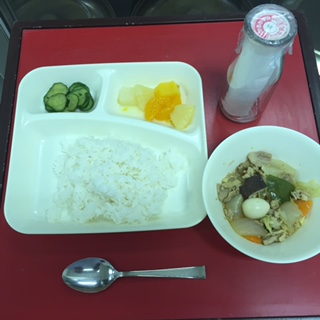 本日の献立は、「八宝菜・きゅうりのピリ辛あえ・ミックスフルーツ(缶)・ごはん・牛乳」でした。
