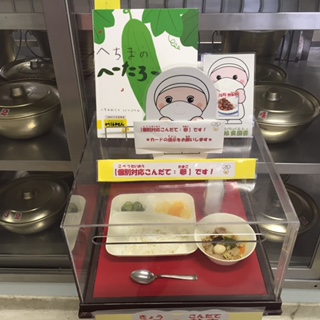 写真中央は、本日の給食図書と献立サンプルです。本日の給食図書は、「へちまのへーたろー」でした。へちまのへーたろーが、女の子からきゅうりに間違われるのが嫌で、一生懸命に立派なへちまになろうと頑張る絵本でした。