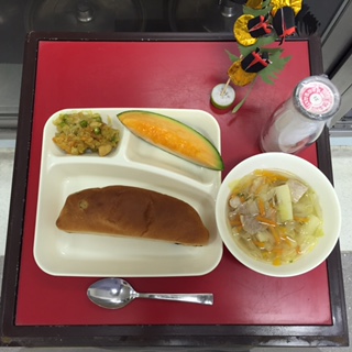 本日の献立は、「カレードリア・キャベツのスープ・クインシーメロン・パン・牛乳」でした。
