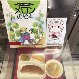 写真中央は、本日の給食図書と献立サンプルです。本日の給食図書は、「メロンの絵本」でした。メロンの種類や作り方が絵とともに詳しく書かれていました。