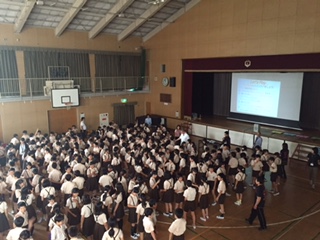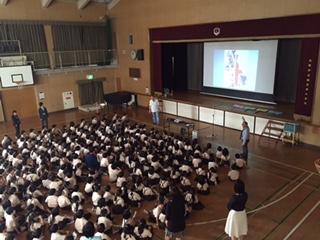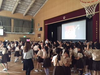 6月4日(土)今年度2回目の土曜授業参観を行い、たくさんの保護者に来ていただきました。講堂では全学年で「鶴南イングリッシュタイム」をしました。低・中・高で内容を少し変えましたが、C-NETのバリー先生のクイズではみんな英語の意味を考えながら楽しく解いていきました。最後にはそれぞれ「トゥモロー」の歌を英語で歌いました。