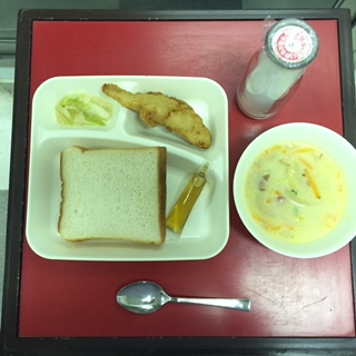 本日の献立は、「サーモンフライ・豆乳コーンスープ・キャベツのソテー・パン・牛乳」でした。