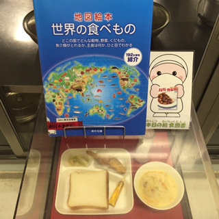 写真中央は、本日の給食図書と献立サンプルです。本日の給食図書は、「地図絵本 世界の食べ物」でした。どこの国でどんな穀物、野菜、くだもの、魚介類がとれるか、主食は何かが、ひと目でわかる図書でした。