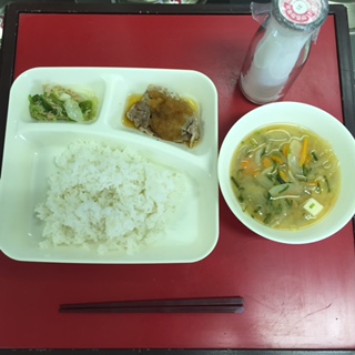 本日の献立は、「豚肉のおろしじょうゆかけ・みそ汁・野菜いため・ごはん・牛乳」でした。