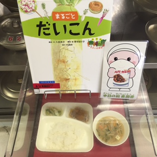 写真中央は、本日の献立サンプルと、給食図書です。本日の給食図書は、「まるごと だいこん」でした。いろいろな大根の種類が載っている図解の図書でした。