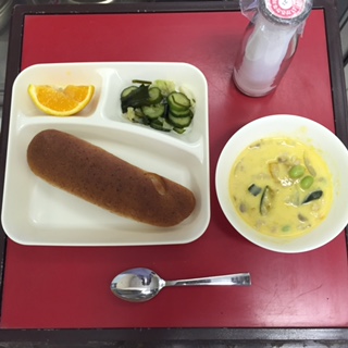 本日の献立は、「かぼちゃのクリームシチュー・ミックス海そうのサラダ・オレンジ・パン・牛乳」でした。