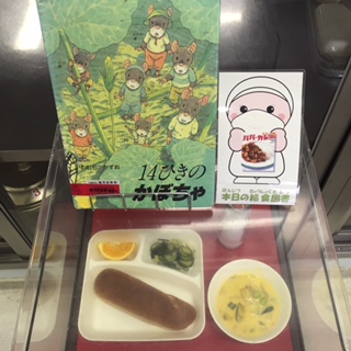 写真中央は、本日の献立サンプルと、給食図書です。本日の給食図書は、「14ひきのかぼちゃ」でした。14匹のねずみの家族が、かぼちゃを種から育て、収穫してみんなで食べるまでを描いた絵本でした。