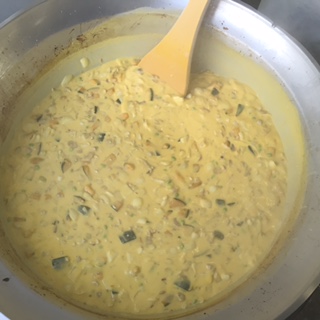 写真右は、かぼちゃのクリームシチューを煮ている様子です。