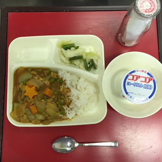 本日の献立は、「チキンカレーライス・キャベツと三度豆のサラダ・ヨーグルト・牛乳」でした。