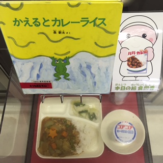 写真中央は、本日の献立サンプルと、給食図書です。本日の給食図書は、「かえるとカレーライス」でした。山から突然カレーが噴き出し、そのカレーをかえるが食べる不思議な絵本でした。
