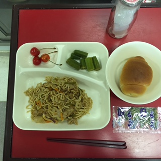 本日の献立は「焼きそば・オクラの中華あえ・さくらんぼ・パン・牛乳」でした。