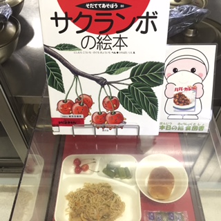 写真中央は、本日の献立サンプルと、給食図書です。本日の給食図書は、「サクランボの絵本」でした。サクランボの名前の由来や種類、育て方等が載った絵本でした。