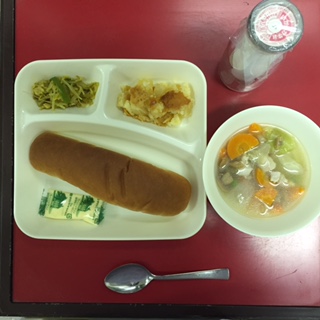 本日の献立は「鶏肉と野菜のスープ煮・カレーソテー・りんごのクラフティ・パン・牛乳」でした。