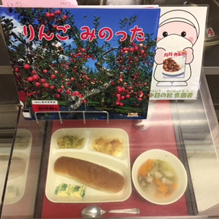 写真中央は、本日の献立サンプルと、給食図書です。本日の給食図書は、「りんご みのった」でした。りんご農家の仕事を通して、りんごが花から実がなり、そして収穫するまでを載せた、りんごの実のでき方がわかる図書でした。
