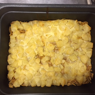 りんごのクラフティは、コーンフレークを敷き、その上に鶏卵、砂糖、クリーム、小麦粉、りんご(缶)を合わせた生地を流し、焼き物機で蒸し焼きにした、焼き物のデザート献立でした。クラフティはフランスの伝統的なお菓子です。