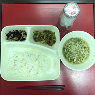 本日の献立は「牛肉とキャベツのいためもの・かきたま汁・枝豆入りひじき・ごはん・牛乳」でした。学校給食献立コンクールの最優秀賞献立を基に作成した献立でした。