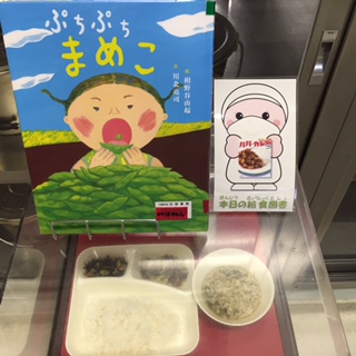 写真中央は、本日の献立サンプルと、給食図書です。本日の給食図書は、「ぷちぷち まめこ」でした。枝豆が大好きなまめこは、枝豆を育て始めるのですが、いろいろな野菜にいじわるなアドバイスをもらいます。はたして、まめこはどうなったでしょう。興味のある方は読んでみてくださいね。