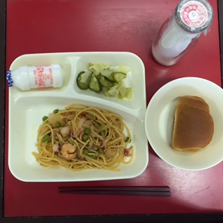 本日の献立は「シーフードスパゲッティ・グリーンサラダ・はっ酵乳・パン・牛乳」でした。