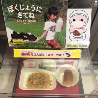 写真中央は、本日の献立サンプルと、給食図書です。本日の給食図書は、「ぼくじょうにきてね」でした。家の仕事が酪農である女の子の目線で、牧場の仕事や、家畜と人の関係が書かれた図書でした。