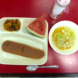 スープは、チキンスープをベースに、鶏肉、にんじん、キャベツ等が入った、汁物献立でした。