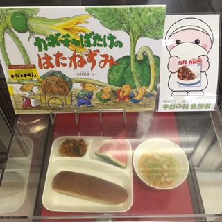 写真中央は、本日の献立サンプルと、給食図書です。本日の給食図書は、「カボチャばたけのはたねずみ」でした。ある日、はたねずみの一家は畑になっているカボチャを見つけました。そして、そのカボチャを食べながら自分たちの住みやすい家にしていく絵本なのですが…その先が気になった方は実際に読んでみてください。