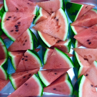 写真右は、バットに並べられた、1/64個のすいかの様子です。