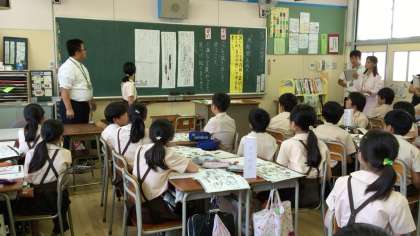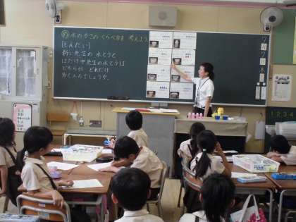 2年と5年で研究授業をしました。2年生は、算数「水のかさをはかろう」で、初めに大きさの異なる二つの容器を隠して、カップ何杯分入るか伝え、どちらの容器が大きいか予想させました。子どもたちの予想と容器の大きさが異なったことから、共通の単位の必要性に気付き、dLの単位を知るという学習内容でした。2年生の子どもたちは実際に容器で水を量る活動をしながら楽しく学習しました。