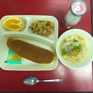 じゃがいものスープは、チキンスープをベースに、豚肉、じゃがいも、キャベツ等が入った、汁物献立でした。