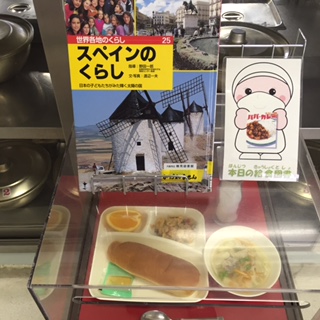 写真中央は、本日の献立サンプルと、給食図書です。本日の給食図書は、「スペインのくらし」でした。スペインの風土や文化が書かれている図書で、本日の献立のパエリアも載っていました。