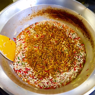 写真右は、パエリアを作っている様子で、調味料のカレー粉を入れた時の様子です。