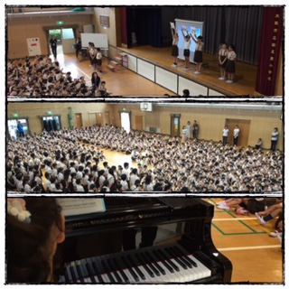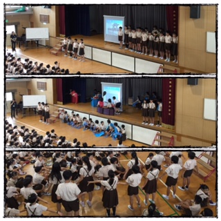 7月14日(木)昨日までの雨も上がって、今日は朝からセミの声が響いています。4年生は社会見学で柴島浄水場へ元気に出発しました。児童朝会では、6年生が「湖っ子スクールの様子」を発表してくれました。初めにスクリーンに琵琶湖水生植物園のきれいな花の写真を映しながら、見学の様子楽しく説明しました。続けてカヤック体験で波の間を進むカヤックを劇で演じました。次に夜の集いで歌った学級の歌を振り付けと共に紹介しました。また、うどん作りの様子もクイズ形式で発表しました。最後に「未来へのレシピ」という歌を全員で合唱しました。楽しかった宿泊行事の様子を、笑顔と大きな声で明るく元気に発表する6年生の姿はとてもカッコ良く、見ていた他学年の人たちも大きな拍手を送っていました。