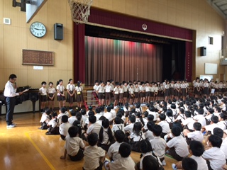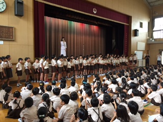 講堂での始業式では、校長先生から「夏休み元気に過ごしましたか?オリンピックで選手の人たちががんばっていたように、皆さんも2学期に自分で一生懸命がんばったよと言えるようにしてください。」というお話がありました。続けて夏休みに行われた「学童泳力記録会」と「大阪市小学生スポーツ交流大会 陸上競技の部」に出場した子どもたちに、記録証が授与されました。最後にみんなで校歌を斉唱して始業式を終わりました。