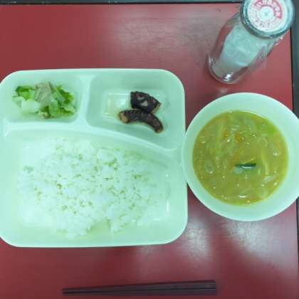 本日の献立は「たこのやわらか煮・みそ汁・野菜いため・ごはん・牛乳」でした。